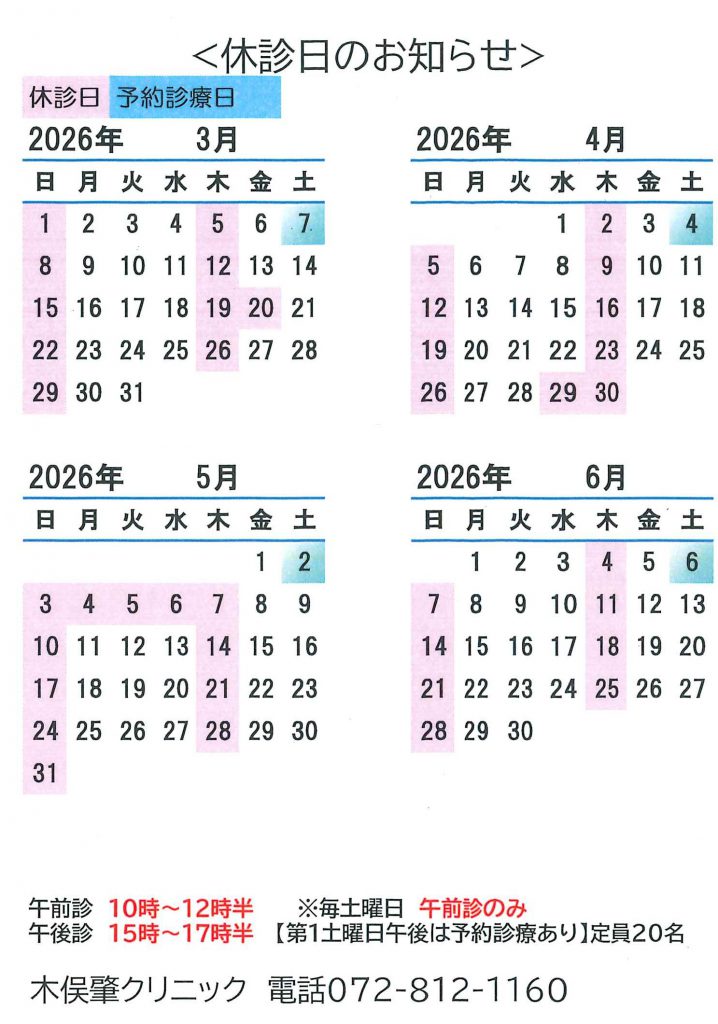この他にも臨時休診となる場合もございますので、最新の情報はホームページ・電話にてご確認ください。